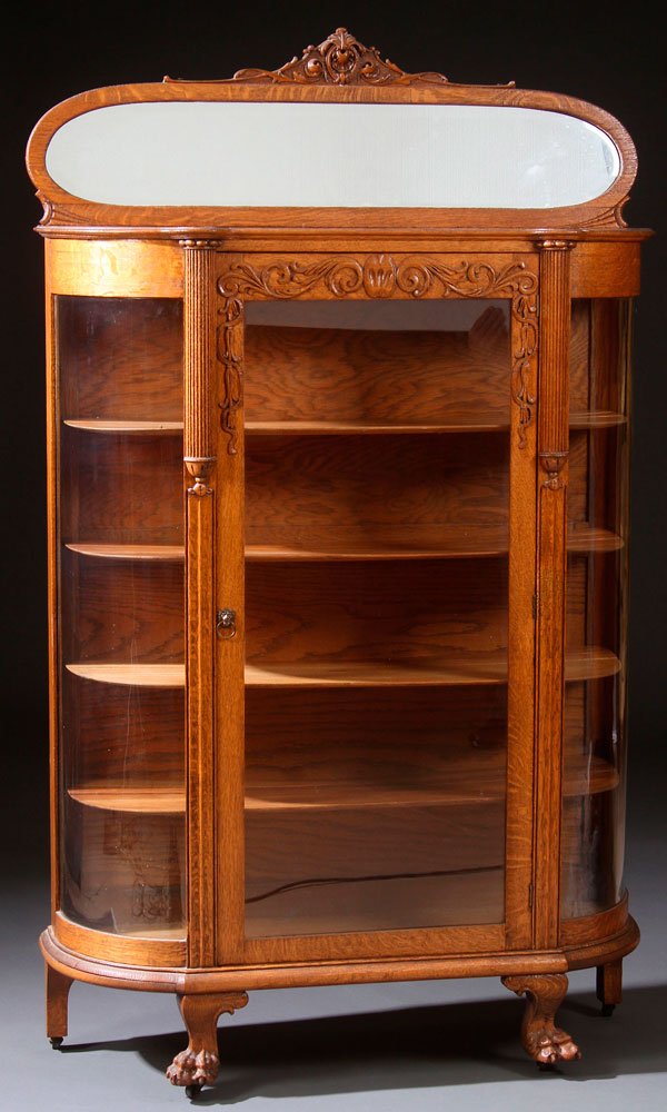Touch device users, explore by touch or with swipe. Antique oak bow glass claw feet glass curio crystal display cabinet mirror back. 39 x 16 x 59. The wood grain is absolutely stunning. I have a1901 to 1911 solid oak china cabinet with lions faces curved glass.